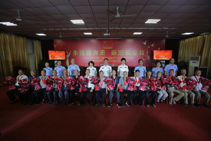 监狱党委书记、监狱长苗可致辞。他讲到,颁发“光荣在党50年”纪念章是对50载初心如磐老党员的充分肯定,是传递党的关怀的温暖务实之举,广大党员老干部一生对党忠诚、拼搏奋斗、无私奉献,为我们树立了好榜样,让我们过上了好生活,给我们传承了好作风。希望中青年党员接过历史的接力棒,不断保持和发扬党的胜利成果,将党的事业、监狱事业持续发展和壮大,铭记入党时的铮铮誓言,在党言党、在党爱党、在党忧党、在党为党,为加快新时代“美丽女监”建设发光发热,增添光彩!苗可同志与党委副书记、政委刘依林,党委副书记、秦星服饰有限公司总经理潘雯一起为老党员颁发“光荣在党50年”纪念章,青年干警代表为老党员献花。当看着16位老党员胸戴金灿灿的纪念章、手捧鲜花站在舞台上时,同志们热泪盈眶,纷纷起立鼓掌,现场挥舞小红旗,气氛热烈,仿佛回到了那个情怀炽热、激情昂扬的革命年代,青年干警再次感受到了热爱党、热爱祖国、热爱事业的赤胆忠心。
