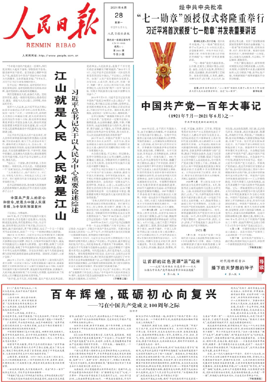 “赤潮澎湃,晓霞飞动,惊醒了,五千余年的沉梦。”中国产生了共产党,这是开天辟地的大事变。从1921年到2021年,百年大党,百年华章,这是矢志践行初心使命、筚路蓝缕奠基立业、创造辉煌开辟未来的一百年,是用鲜血、汗水、泪水、勇气、智慧、力量写就的一百年,是苦难中铸就辉煌、挫折后毅然奋起、探索中收获成功、失误后拨乱反正、转折中开创新局、奋斗后赢得未来的一百年。