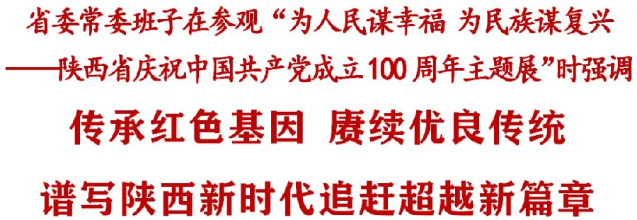 6月25日,省委常委班子集体参观“为人民谋幸福 为民族谋复兴——陕西省庆祝中国共产党成立100周年主题展”,强调要充分展示我们党百年伟大成就和党中央在延安13年光辉历程,大力宣传陕西学习贯彻习近平总书记来陕考察重要讲话,贯通落实“五项要求”、“五个扎实”的生动实践,引导广大党员、干部、群众传承红色基因,赓续优良传统,汲取前进力量,以永不懈怠的奋斗姿态投身新时代追赶超越。