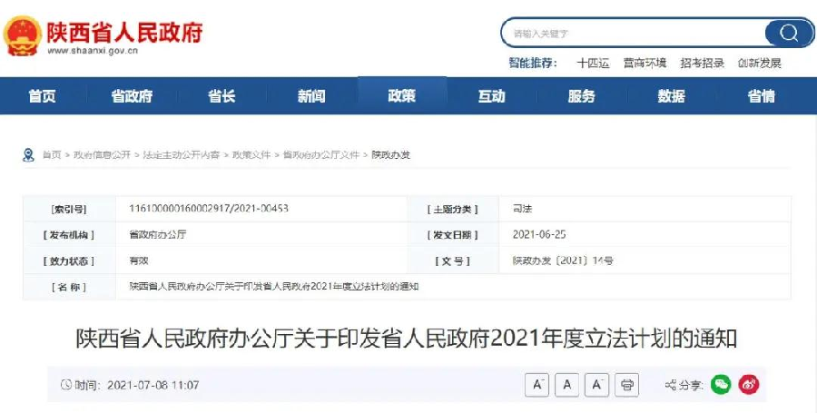 陕西省人民政府办公厅关于印发省人民政府2021年度立法计划的通知