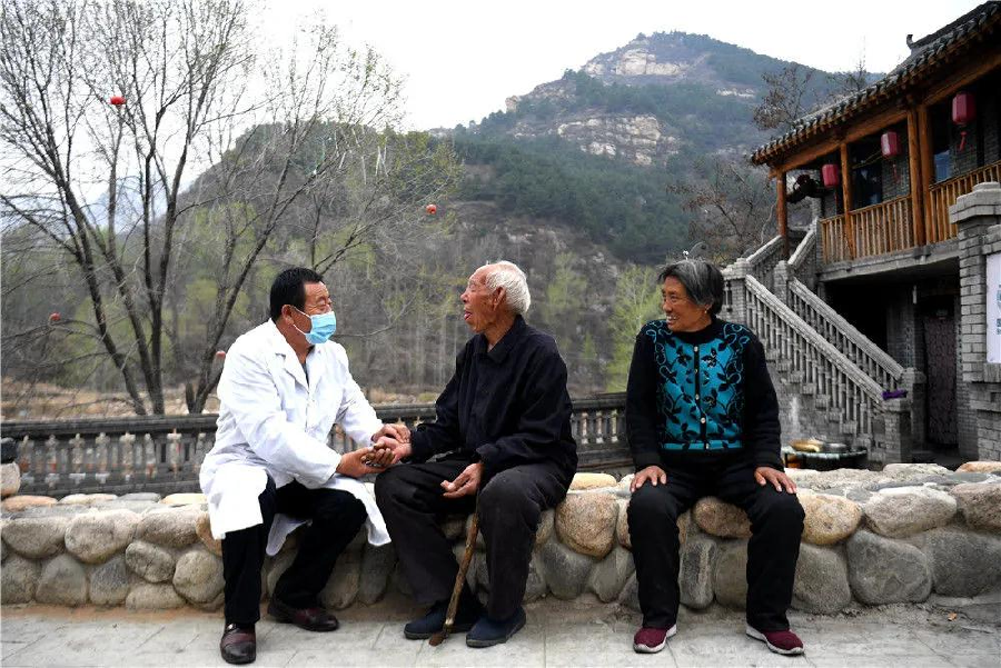 在河北省阜平县骆驼湾村,村医霍建国为村民把脉(2020年4月15日摄)。新华社记者 王晓 摄