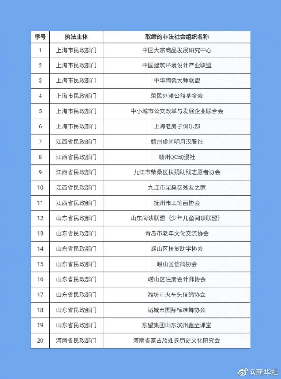 民政部提示,社会公众如果发现名单中的非法社会组织仍在开展活动的,可依法向公安机关报案。