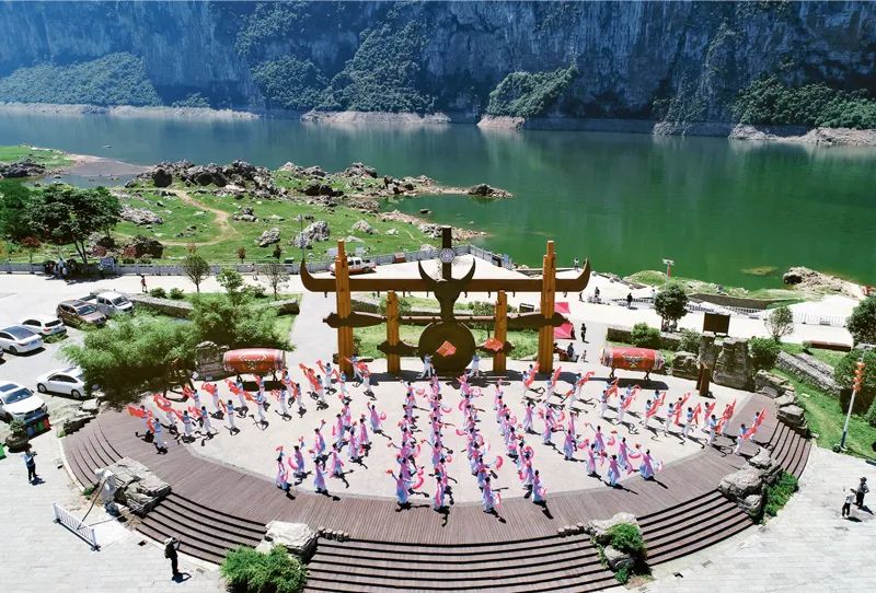 黔西市化屋村曾经是一个贫困发生率高达63.6%的穷山沟,通过精准扶贫,人均可支配收入从2012年的2400元增加到2020年的11500元,世代受贫穷困扰的苗家儿女过上了小康生活。图为2021年6月6日,人们在化屋村码头广场表演舞蹈。贵州省委宣传部供图 史开心/摄