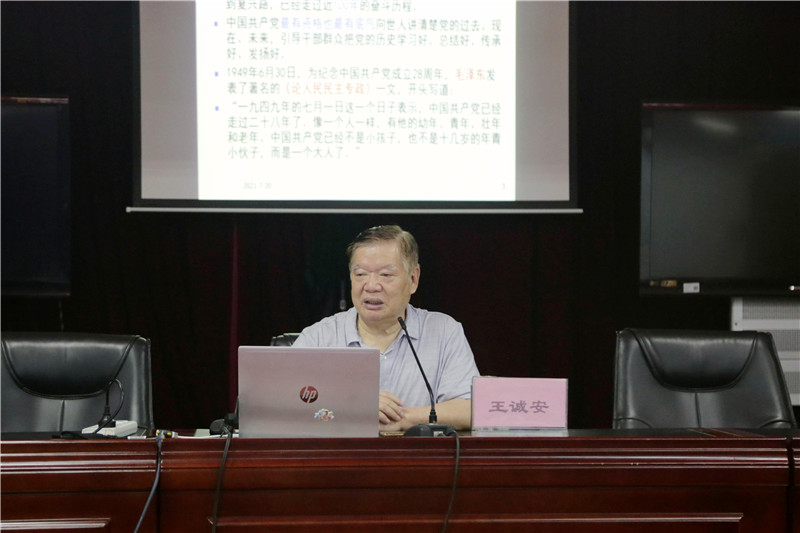 王诚安教授曾任陕西省委党校科社部主任、中国延安干部学院教授、陕西省延安精神研究会特邀研究员。王教授以《奋斗百年路 启航新征程》为主题,重点讲授了习近平总书记“七一”重要讲话关于党领导人民取得的伟大成就,回顾了中国共产党的四个历史时期:建党的开天辟地,中国共产党的创建、中国特色革命道路的开辟、全民族抗日战争的中流砥柱、夺取新民主主义革命的全国胜利;新中国成立的改天换地,新民主主义到社会主义的过渡、探索中国建设道路的良好开端、文化大革命的发动和结束;改革开放的翻天覆地,伟大历史转折和改革开放、改革的重点突破和推进;中国特色社会主义新时代,历史性成就和变革。王教授从“三个为什么”详细阐述了中国共产党为什么“能”、马克思主义为什么“行”、中国特色社会主义为什么“好”,启发和希望全体党员、警察职工从党史学习教育中汲取前进的智慧和力量。王教授把习近平总书记“七一”重要讲话精神和中国共产党一百年的非凡奋斗历程相结合,融入到具体事例中,以案寓理,解读了各个时期发生的重要事件,语言生动,脉络清晰,论述精辟,具有很强的实践性、指导性,对于全面、精准深入学习贯彻习近平总书记“七一”重要讲话精神有着极大的促进作用。