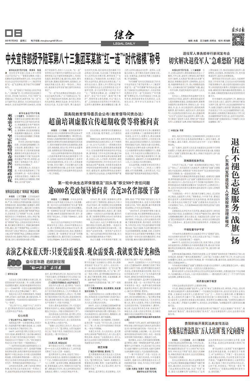 7月28日,《法治日报》综合办刊发了《贵阳积极开展民法典宣传活动 实施基层普法队伍“万人大培训”线下定向指导》的文章。