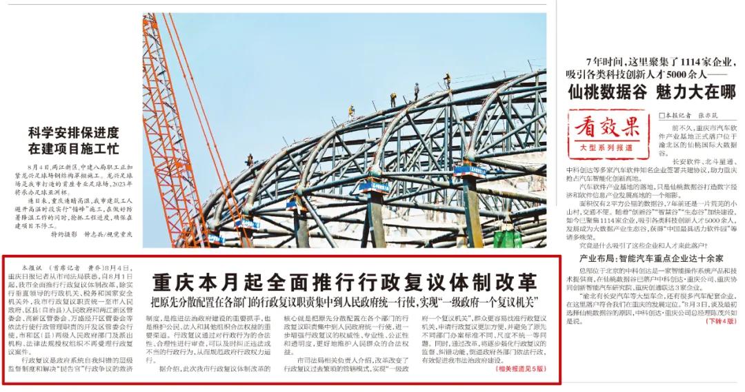 8月4日,重庆日报记者从市司法局获悉,自8月1日起,我市全面推行行政复议体制改革,除实行垂直领导的行政机关、税务和国家安全机关外,我市行政复议职责统一至市人民政府、区县(自治县)人民政府和两江新区管委会、高新区管委会、万盛经开区管委会等依法行使行政管理职责的开发区管委会行使,市和区(县)两级人民政府部门及派出机构、法律法规授权组织不再受理行政复议案件。