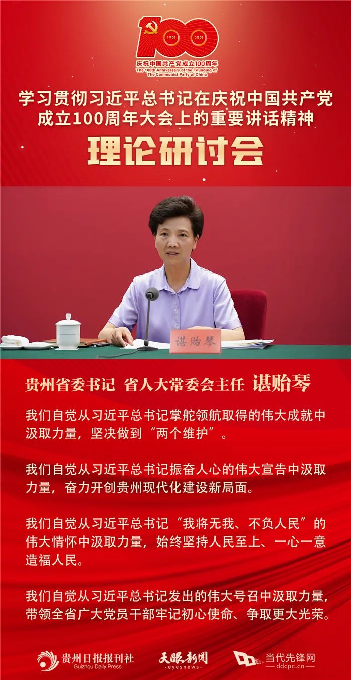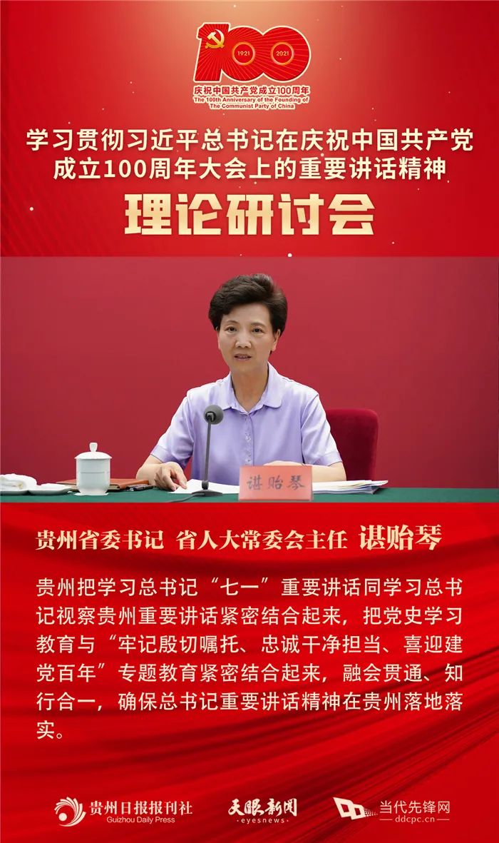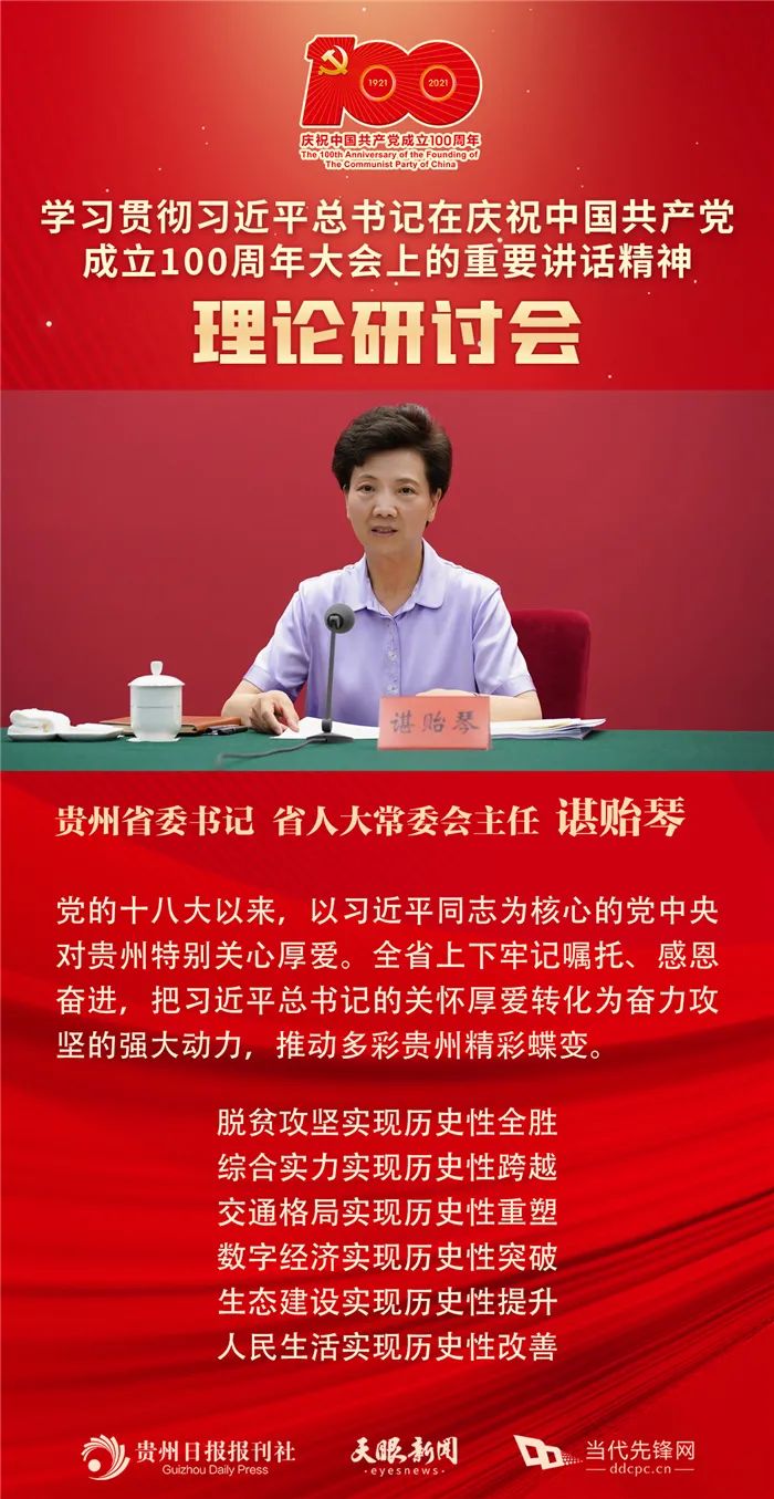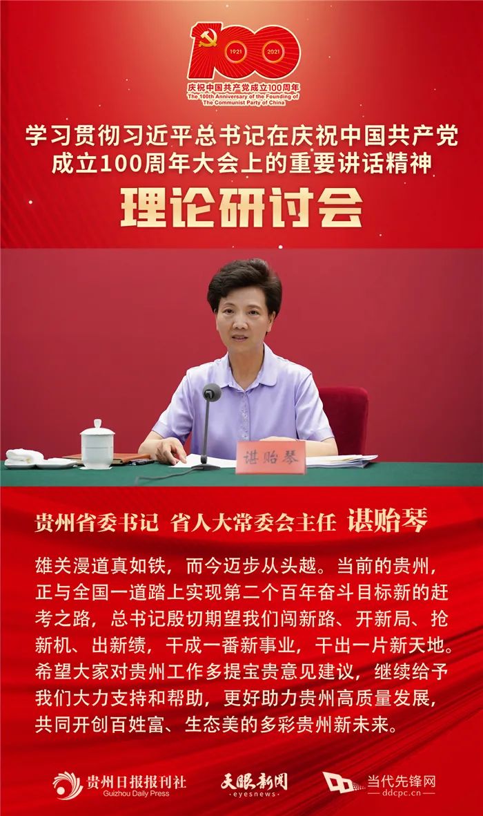 8月2日,学习贯彻习近平总书记在庆祝中国共产党成立100周年大会上的重要讲话精神理论研讨会在贵阳举行。省委书记、省人大常委会主任谌贻琴发表致辞。 本次研讨会由中共贵州省委、求是杂志社共同主办,中共贵州省委宣传部承办,贵州日报报刊社协办。与会嘉宾作了主旨发言和研讨发言。 下面,我们通过一组海报迅速浏览谌贻琴致辞内容——