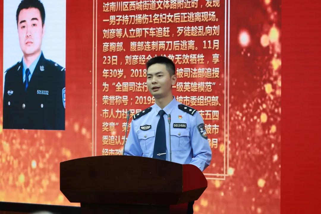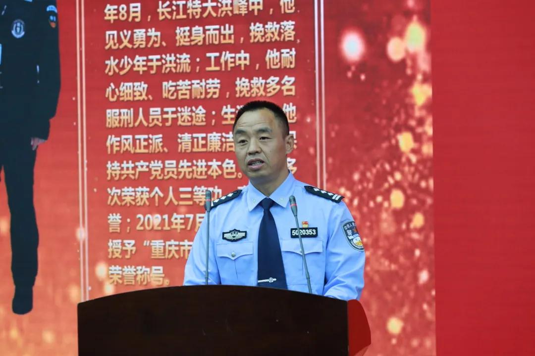 ▲ 南川监狱三级警长金千翔讲述战友——全国司法行政系统一级英模刘彦生前的英勇事迹。