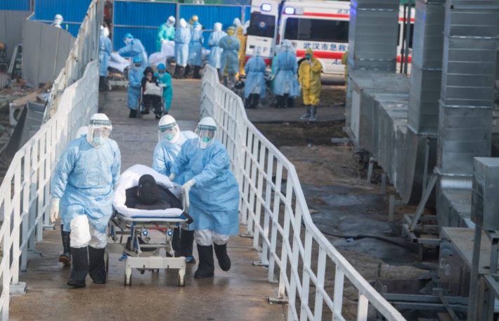 2月4日,医护人员将患者送往病房。当日,武汉火神山医院开始收治新型冠状病毒感染的肺炎确诊患者。