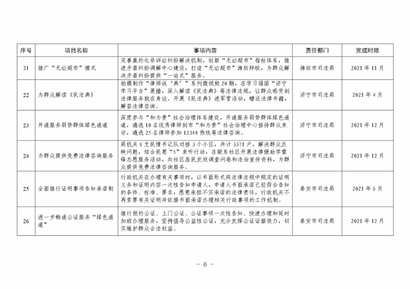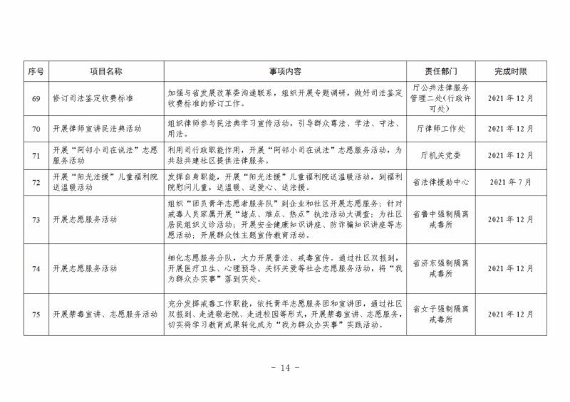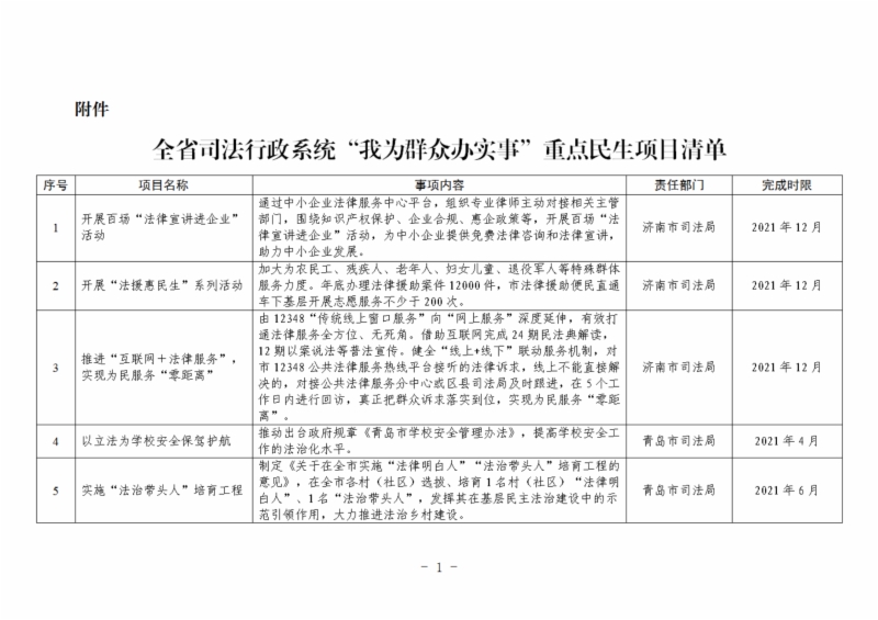 为扎实有效推进全省司法行政系统“我为群众办实事”实践活动,根据省委党史学习教育领导小组《全省“我为群众办实事”实践活动实施方案》通知精神,落实省司法厅《关于在省直司法行政系统开展党史学习教育的实施方案》部署要求,省司法厅立足司法行政工作实际,聚焦群众“急难愁盼”问题,制定重点民生项目76项,现公示如下。