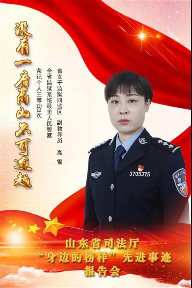 历史烛照时代,榜样传承精神。为深入开展英模教育,用英模人物弘扬正能量,进一步凝心聚力、鼓舞士气,展现全省司法行政队伍良好形象,“山东司法”微信公众号开设“身边的榜样”专栏,集中推送近年来全省司法行政系统涌现出的一批可信可亲、可敬可学的先进典型,通过深入宣传他们的感人事迹,弘扬他们身上体现的忠诚、执着、朴实的鲜明品格,充分展现全省司法行政系统的时代正气、时代风采,激励引领广大干警学英模、铸忠诚、勇担当、争先进,奋力打造忠诚干净担当的新时代司法行政铁军。今天推出第6期,请全省监狱系统最美人民警察、荣记个人三等功3次的省女子监狱四监区副教导员高雪讲述她在监管改造一线默默奉献的感人故事。