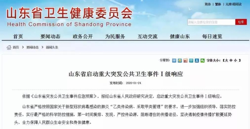 1月24日,据山东卫健委消息,依据《山东省突发公共卫生事件应急预案》,报经山东省人民政府研究决定,启动重大突发公共卫生事件Ⅰ级响应。