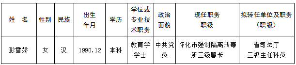 厅党组会议研究,确定彭雪娇同志为厅机关2020年度公开遴选公务员拟遴选对象,根据《2020年湖南省省直机关公开遴选公务员公告》和《关于进一步规范机关事业单位人员流动调配工作的意见》(湘组发〔2015〕26号)等有关规定,现予以公示。