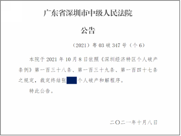10月8日,深圳市中级人民法院形成有关民事裁定书指出,经审查,该案和解程序规范完整,和解过程公开透明,和解协议系债务人与债权人的真实意思表示,未损害国家利益、社会公共利益或者他人合法权益,亦不违反法律、行政法规的强制性规定;并裁定终结张某个人破产和解程序。全国首宗个人破产和解案件办结。